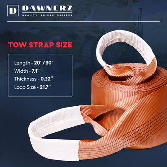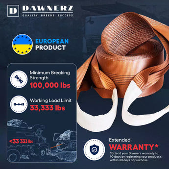 The Dawnerz 100,000 lb recovery tow strap is built for safely towing and recovering vehicles up to 33,333 lbs - a working load limit set at one-third of its break strength to prioritize safety under extreme conditions.